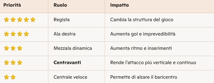 - Attaccante di profondità: il più urgente. Allunga le difese, crea spazi per gli esterni e permette alla squadra di essere più verticale.