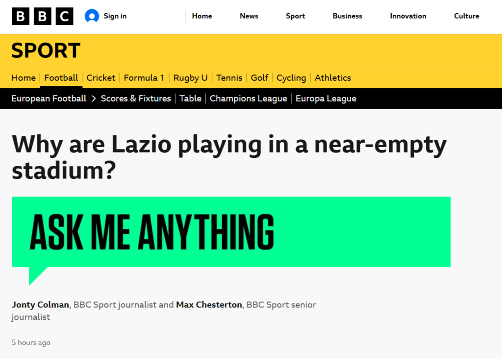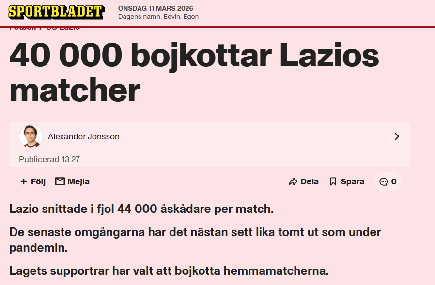 Sportbladet: https://www.aftonbladet.se/sportbladet/fotboll/a/0pVprG/40-000-bojkottar-lazios-matcher