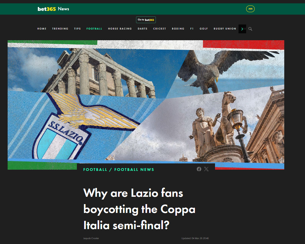 Bet365 news: https://news.bet365.com/en-gb/article/why-are-lazio-fans-boycotting-the-coppa-italia-semi-final/2026030420432615420